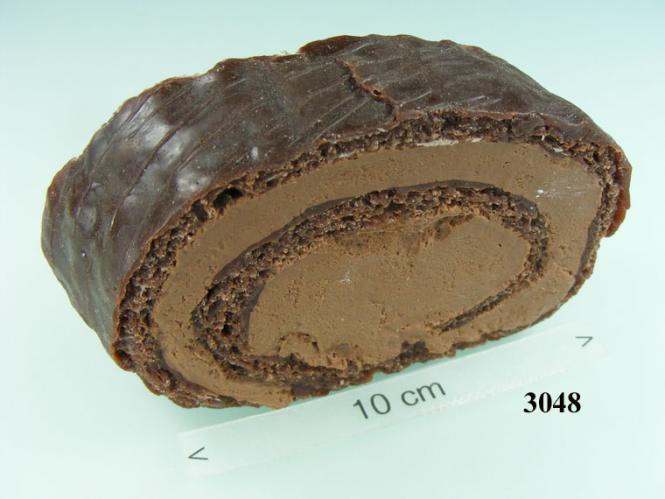 Wirklichkeitsgetreue Nachbildung einer Schoko-Roulade.